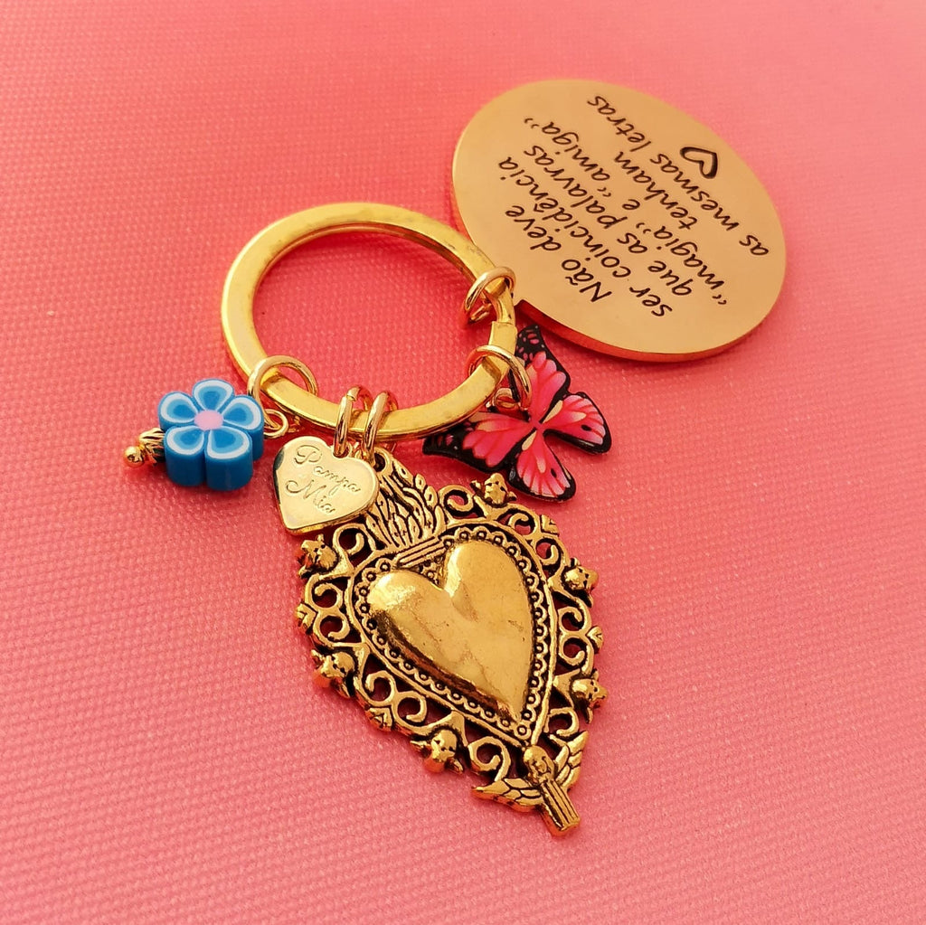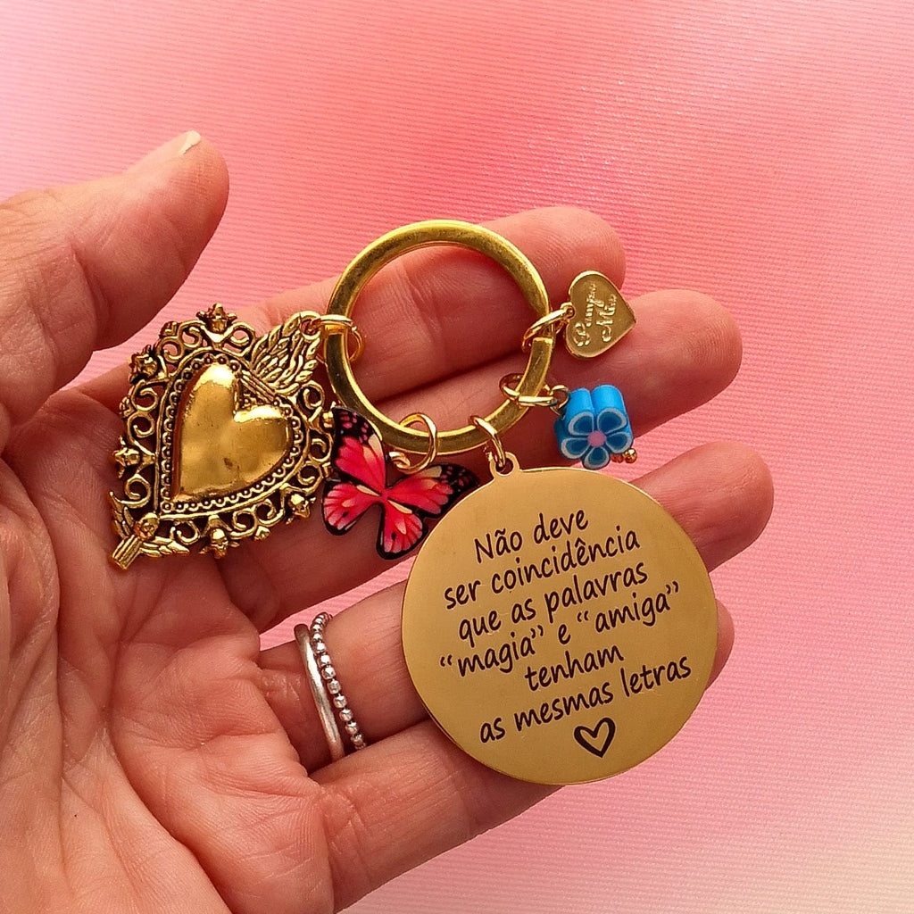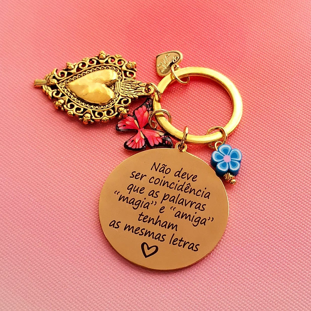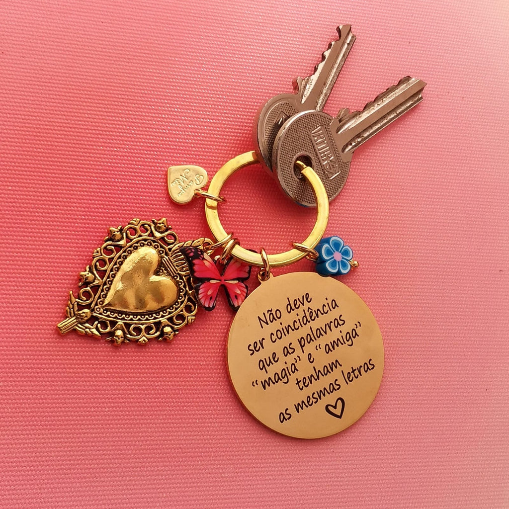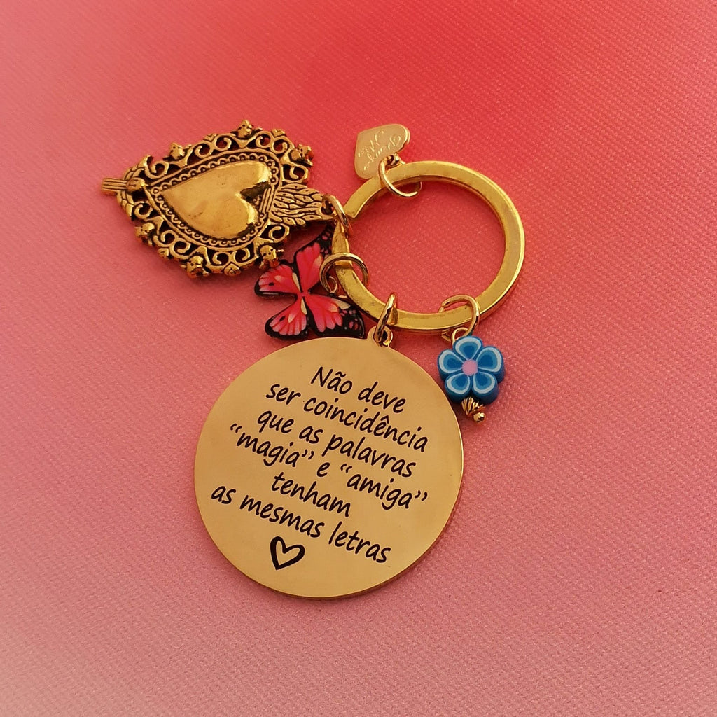 Porta chaves de medalha aço inox de 35 mm com frase amizade, e pendentes Milagrito, borboleta e flor.