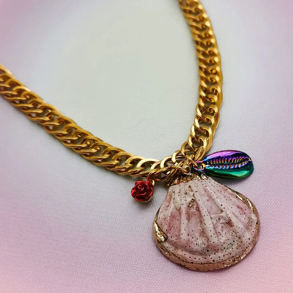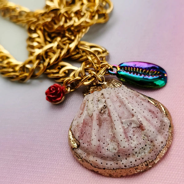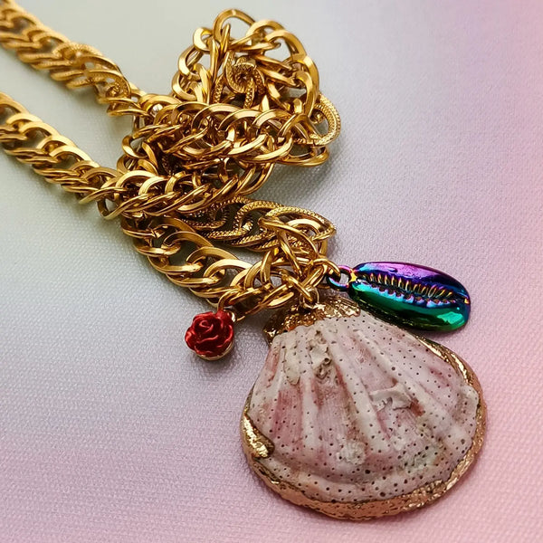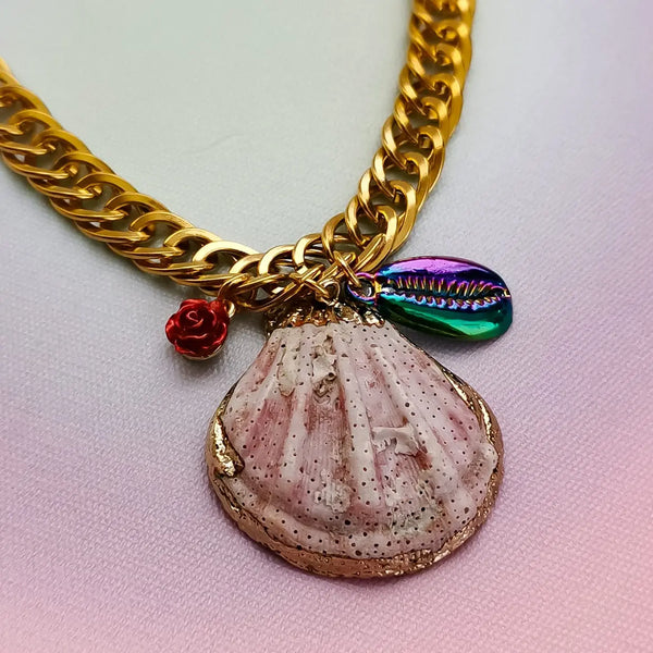 Fio em corrente grossa de aço inox com pendentes buzio + concha.