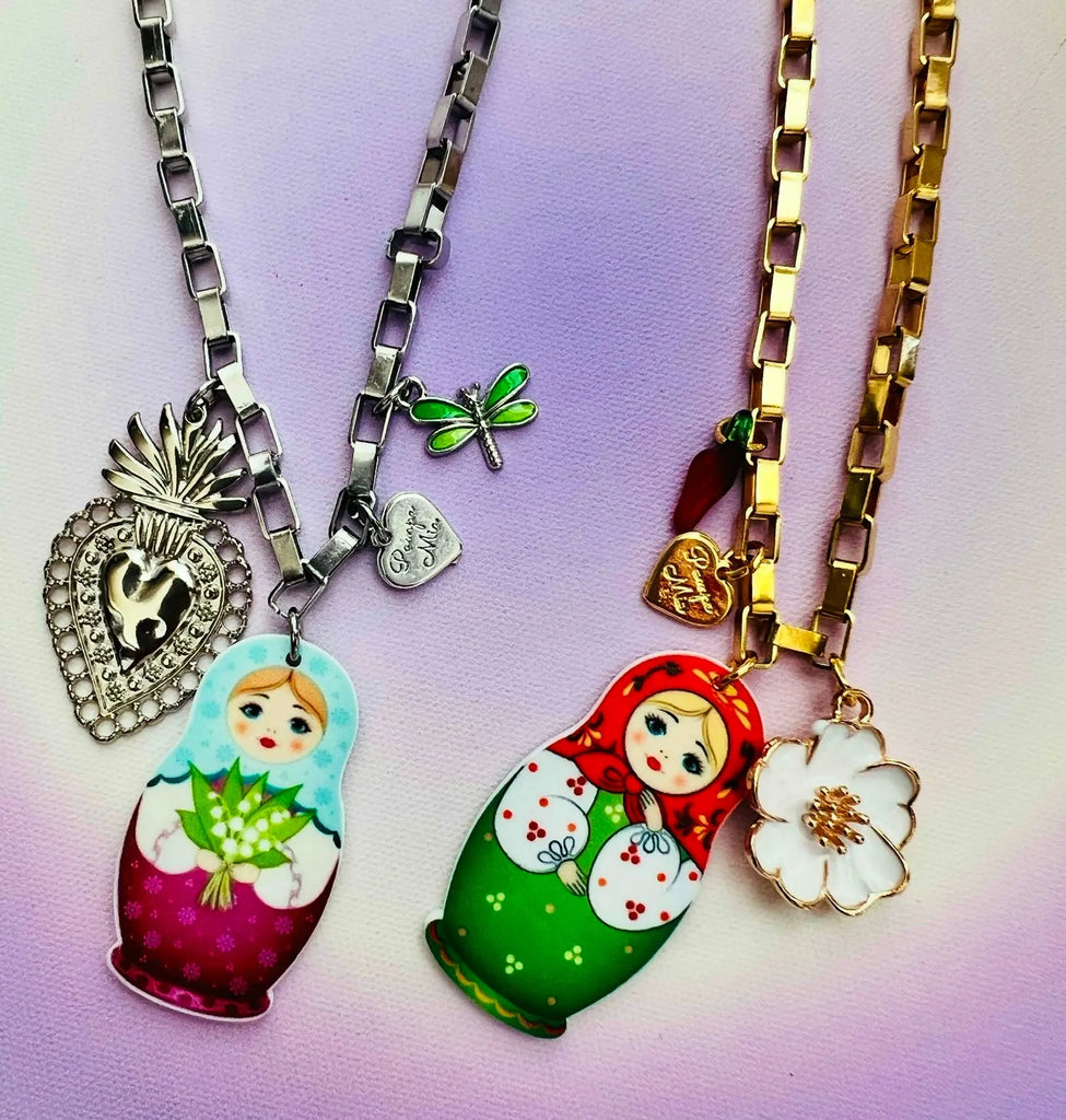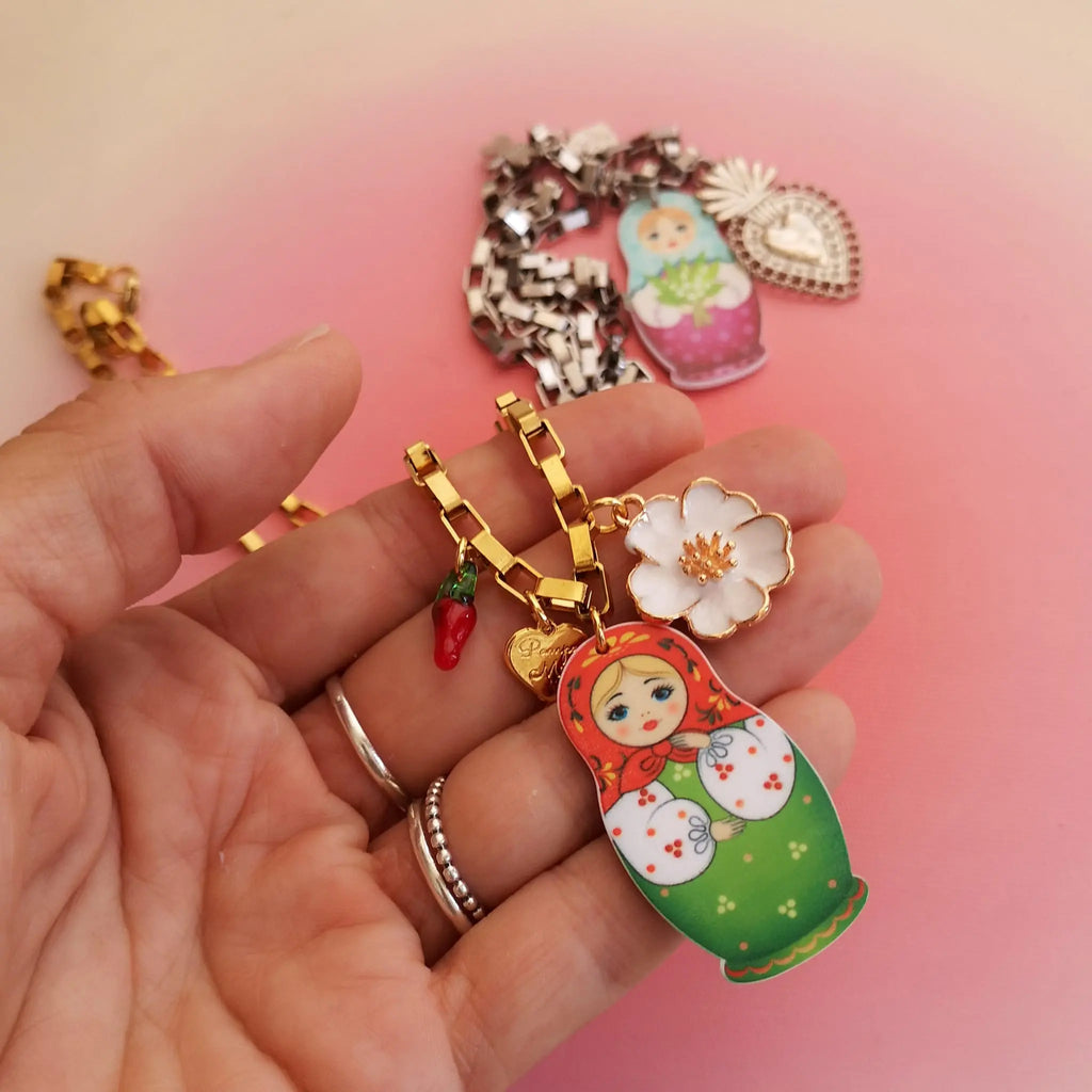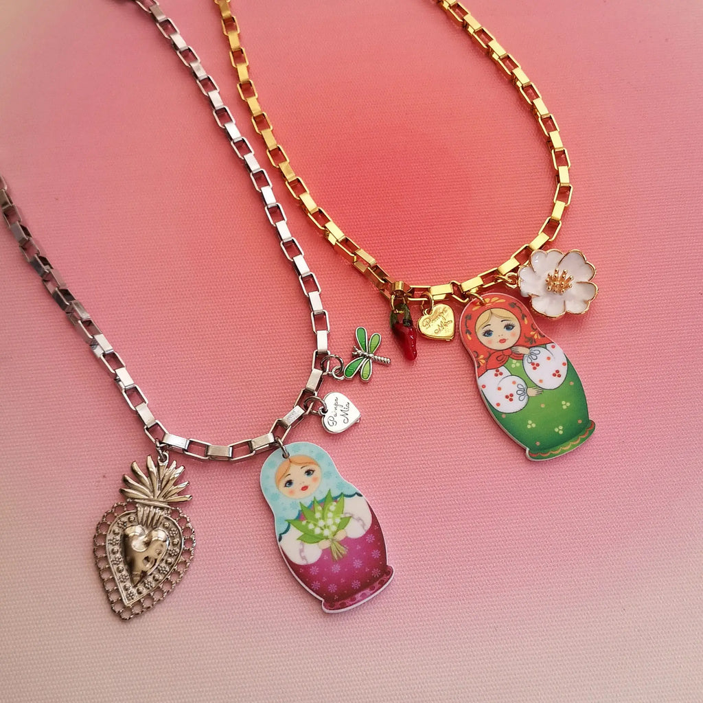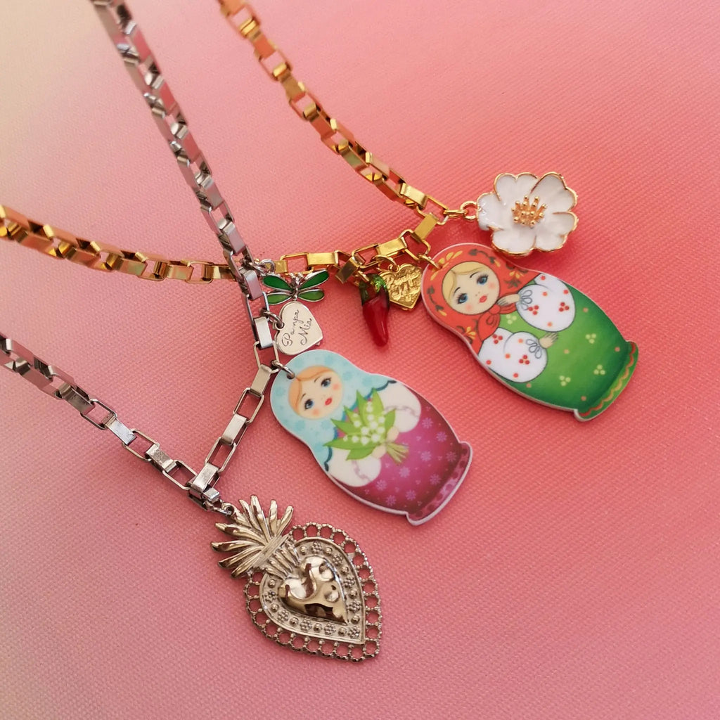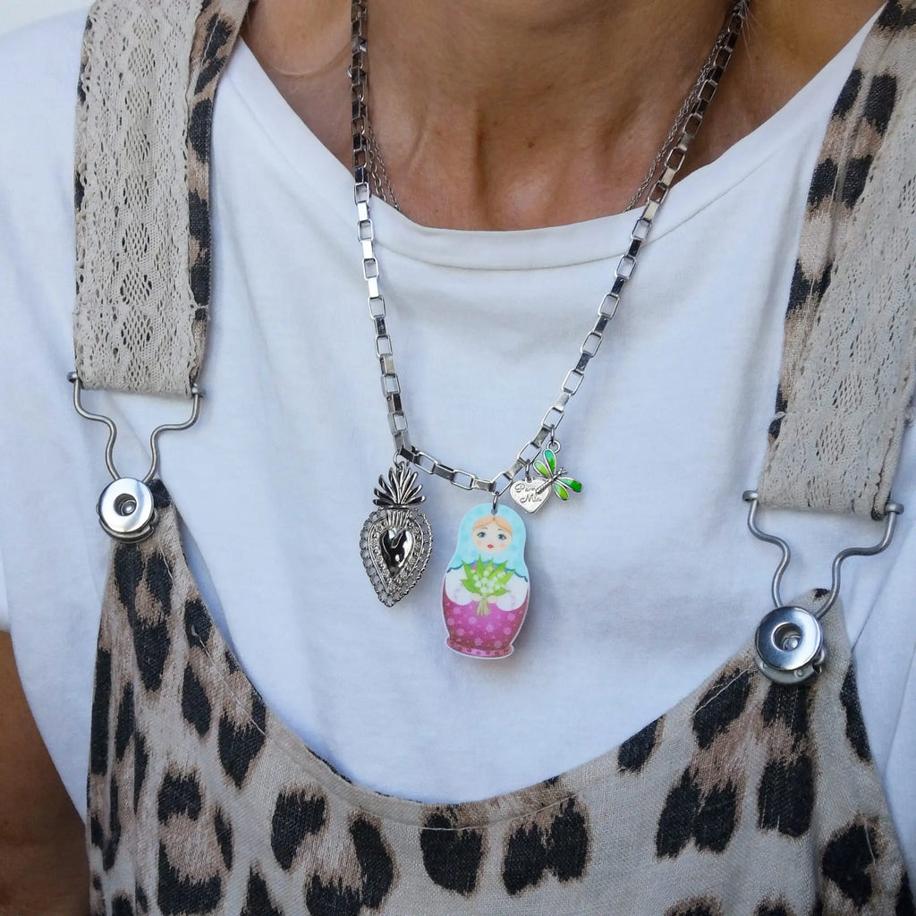 Fios em aço inox prateado com matrioskas acrílicas e outros pendentes.