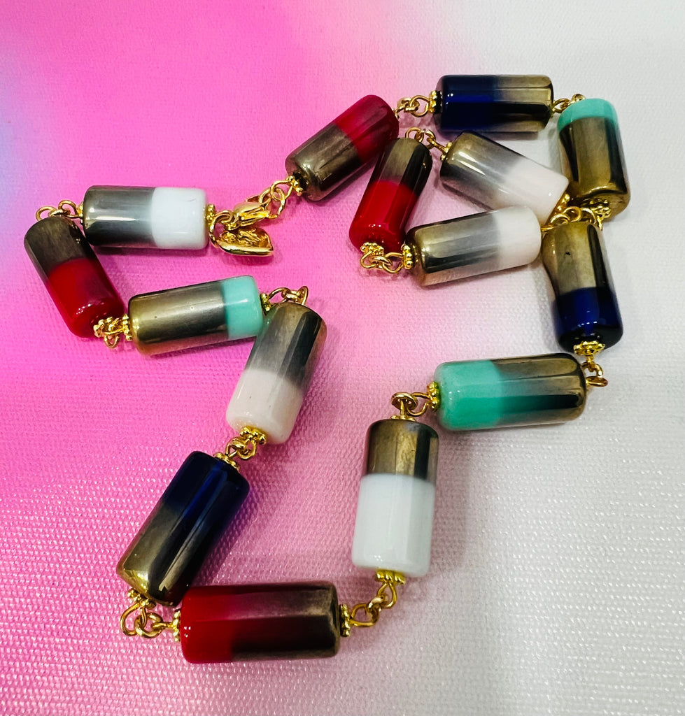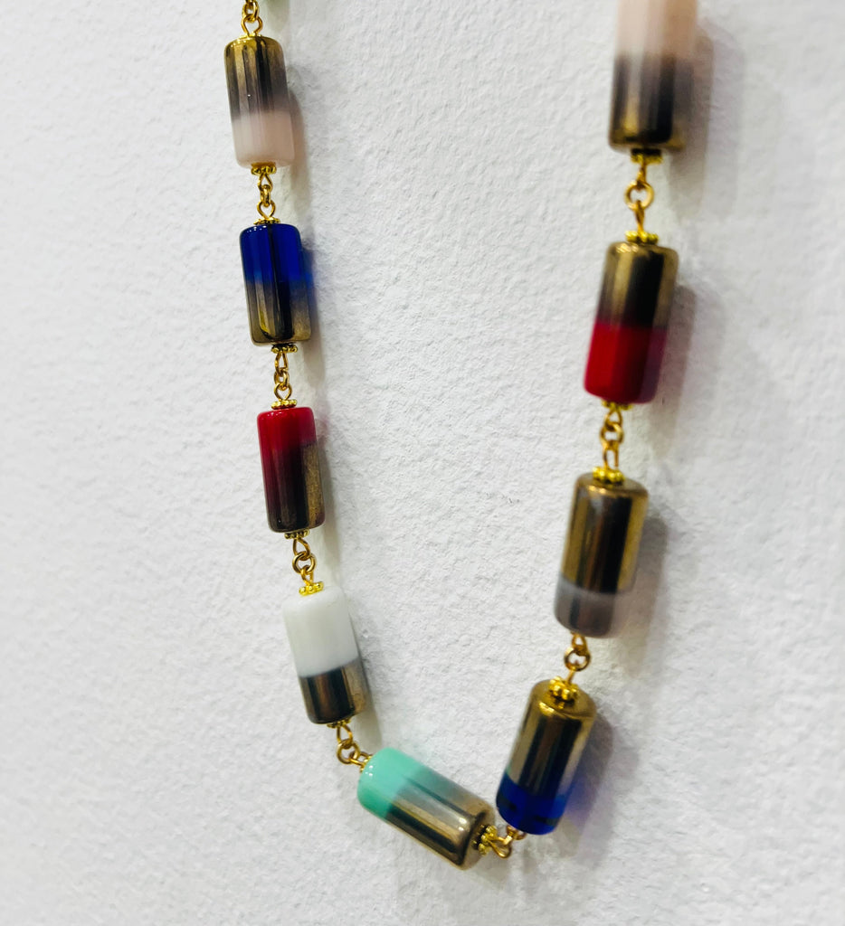 Fio feito com pedras de vidro de duas cores e acabamentos em aço inox dourado.