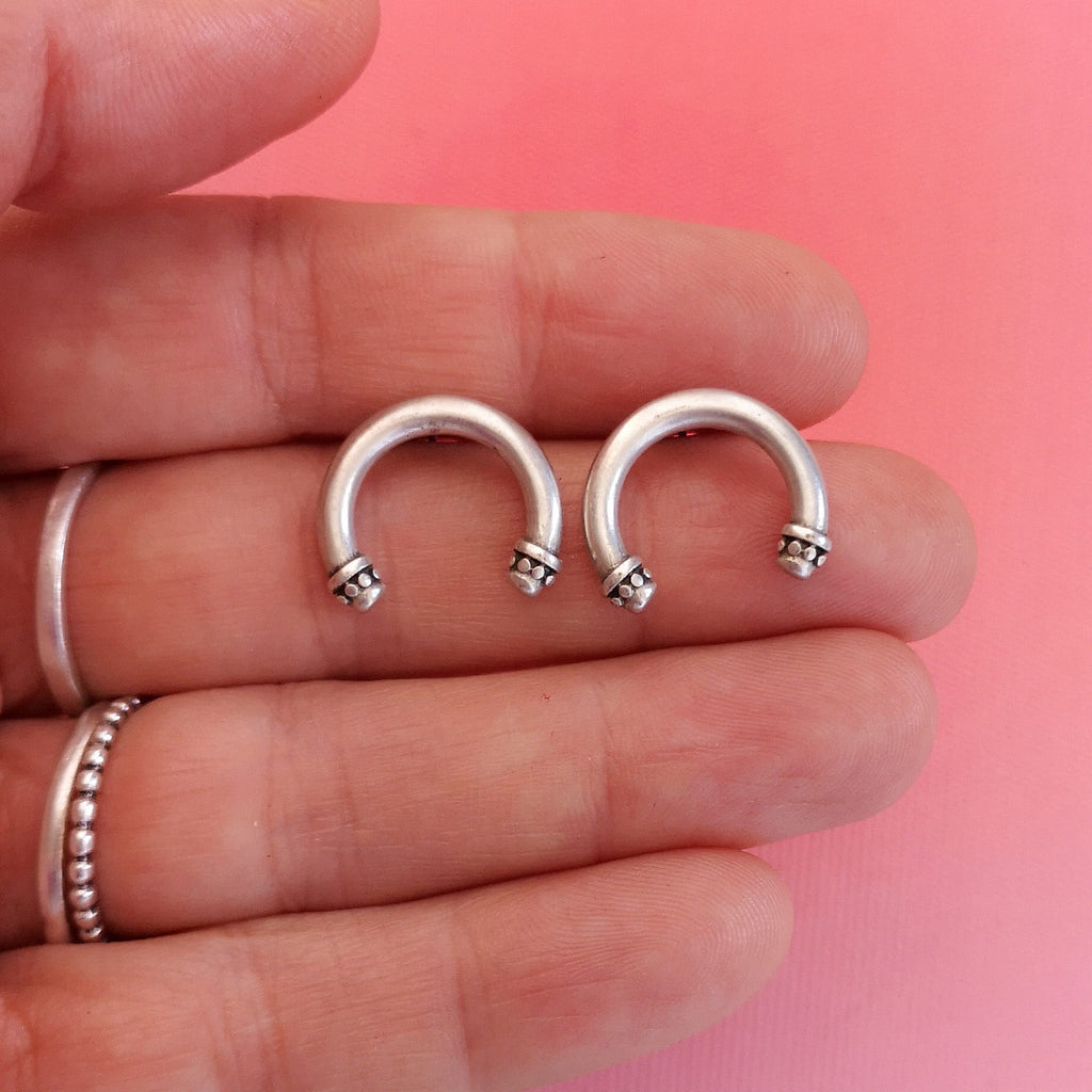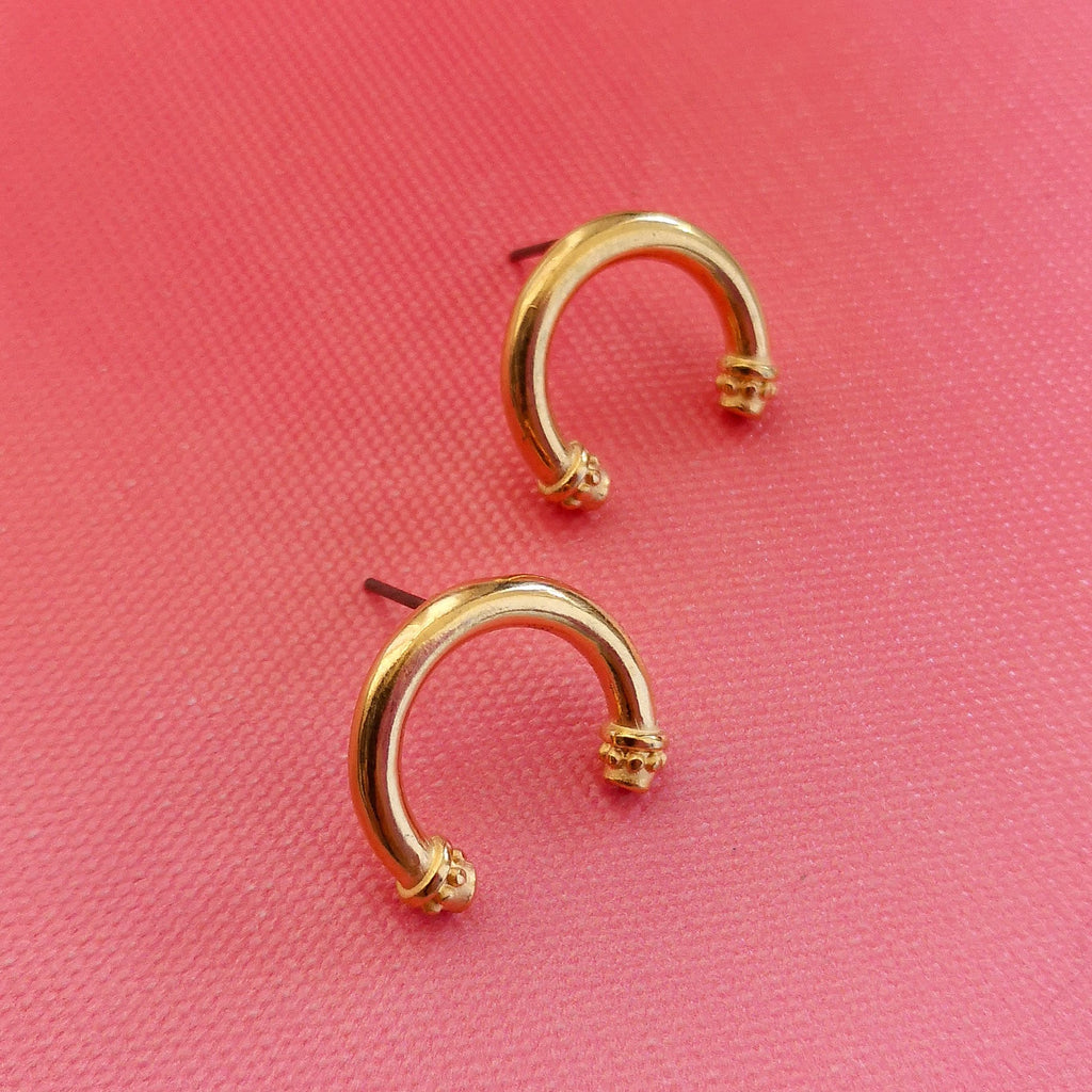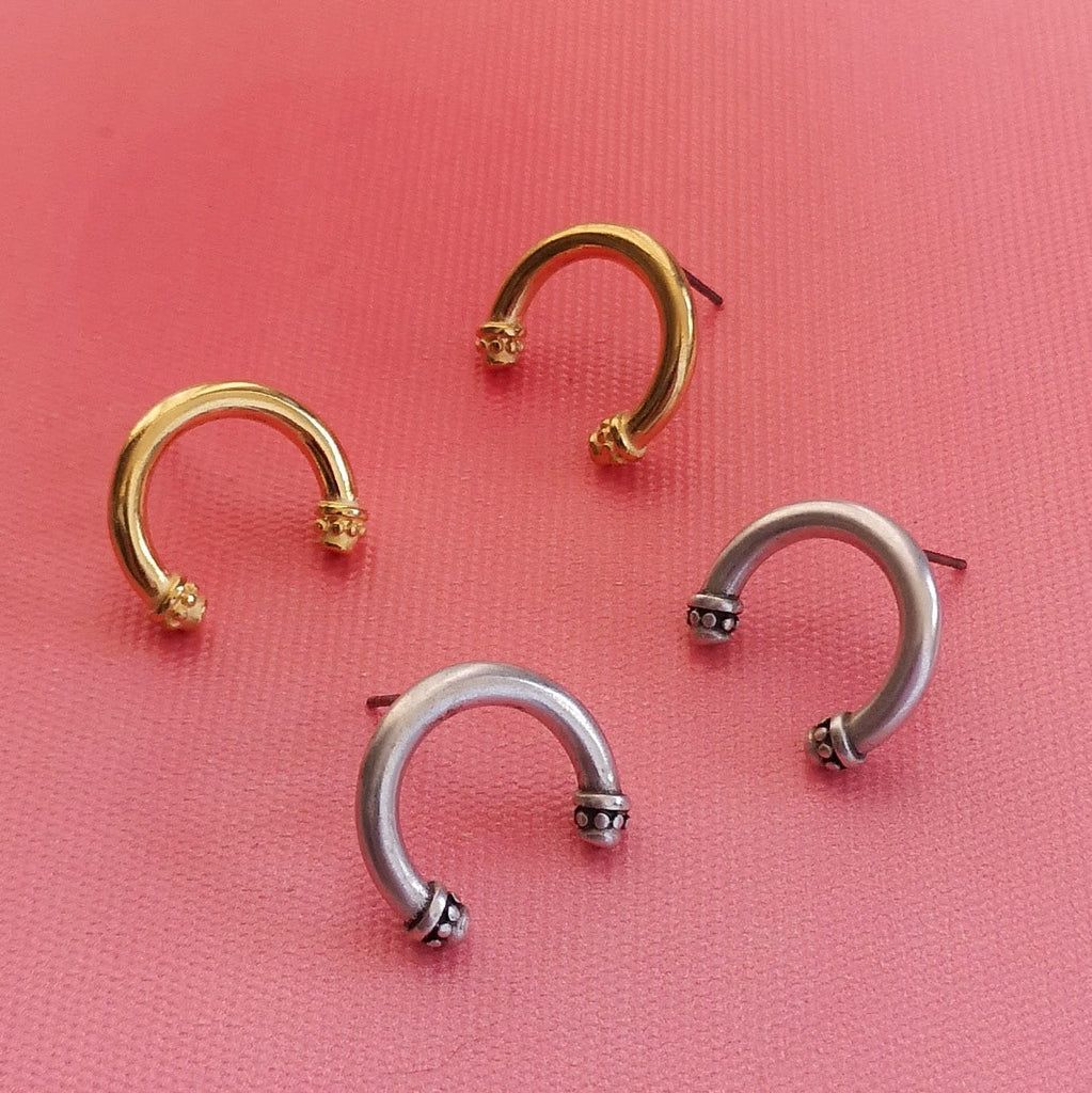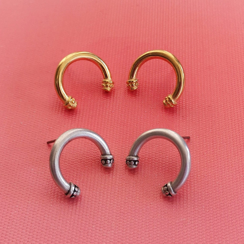 Brincos em zamak prateado ou dourado com formato meia lua invertida.
