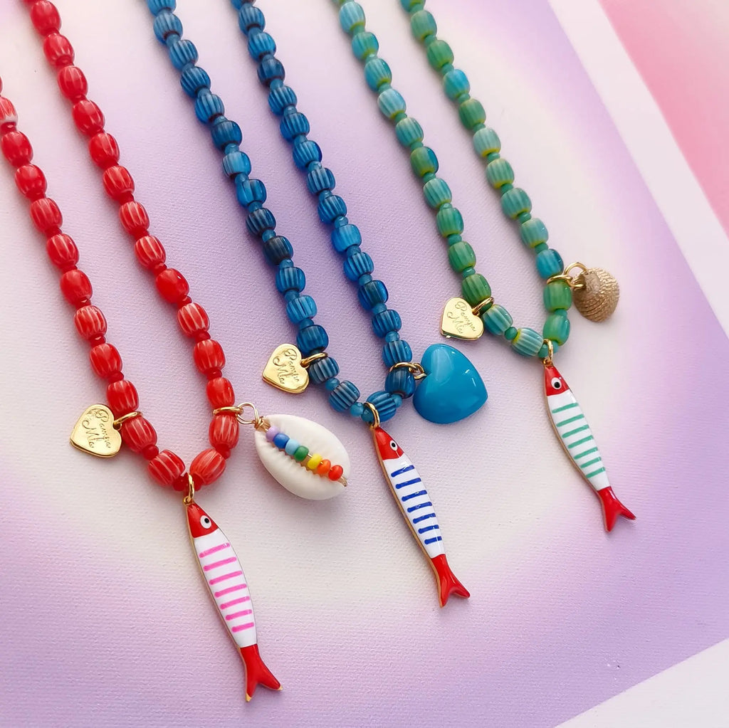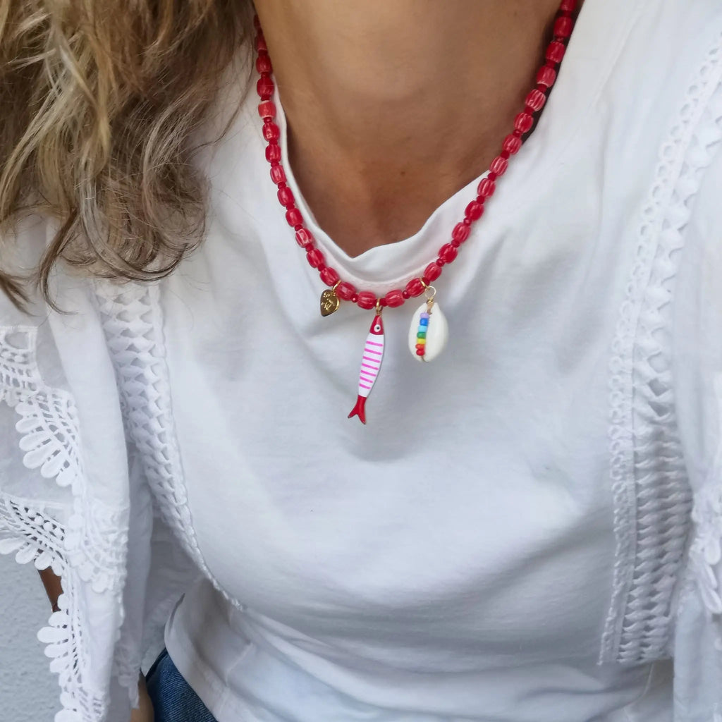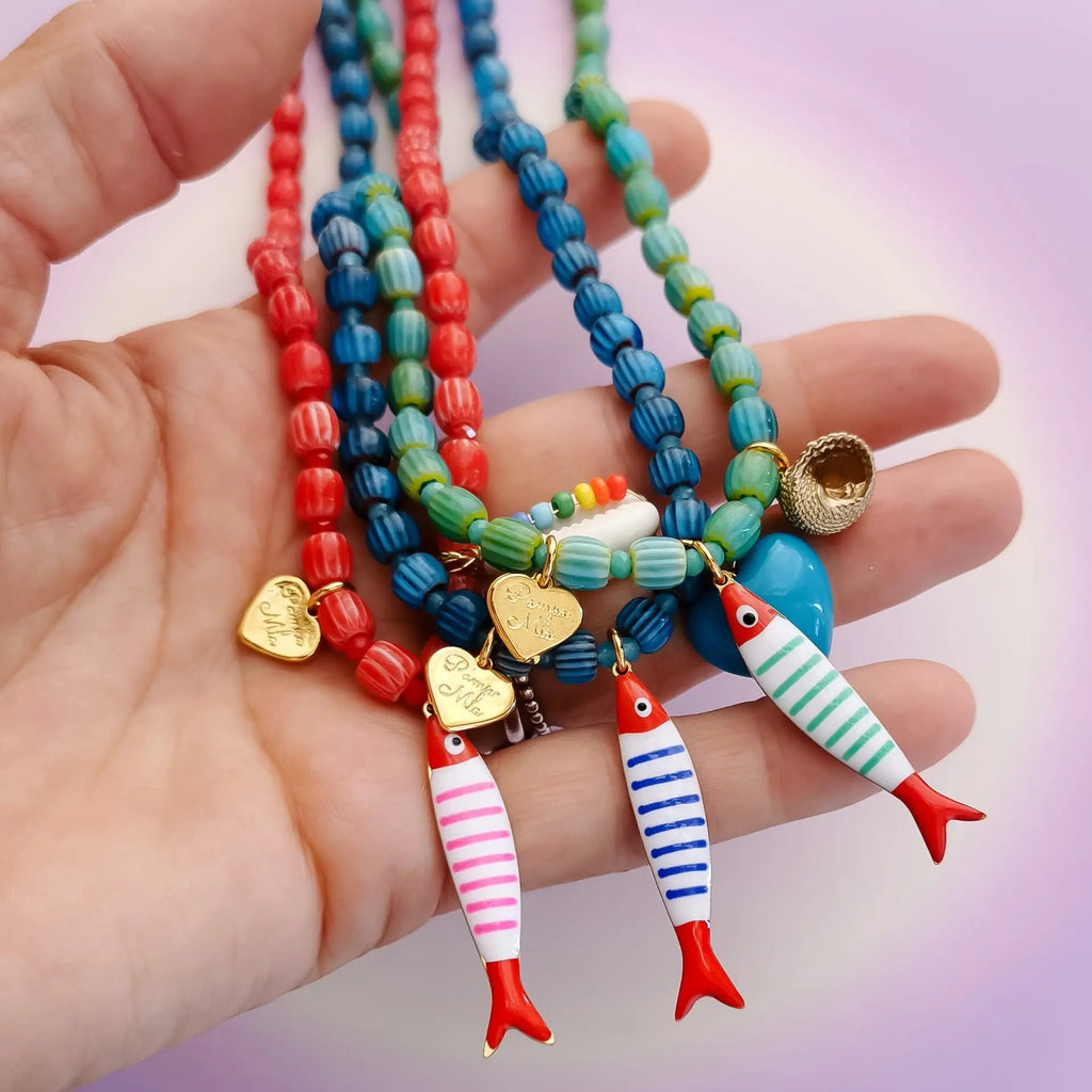 Fio com contas de missangas de vidro e pendente peixe em aço inox.
