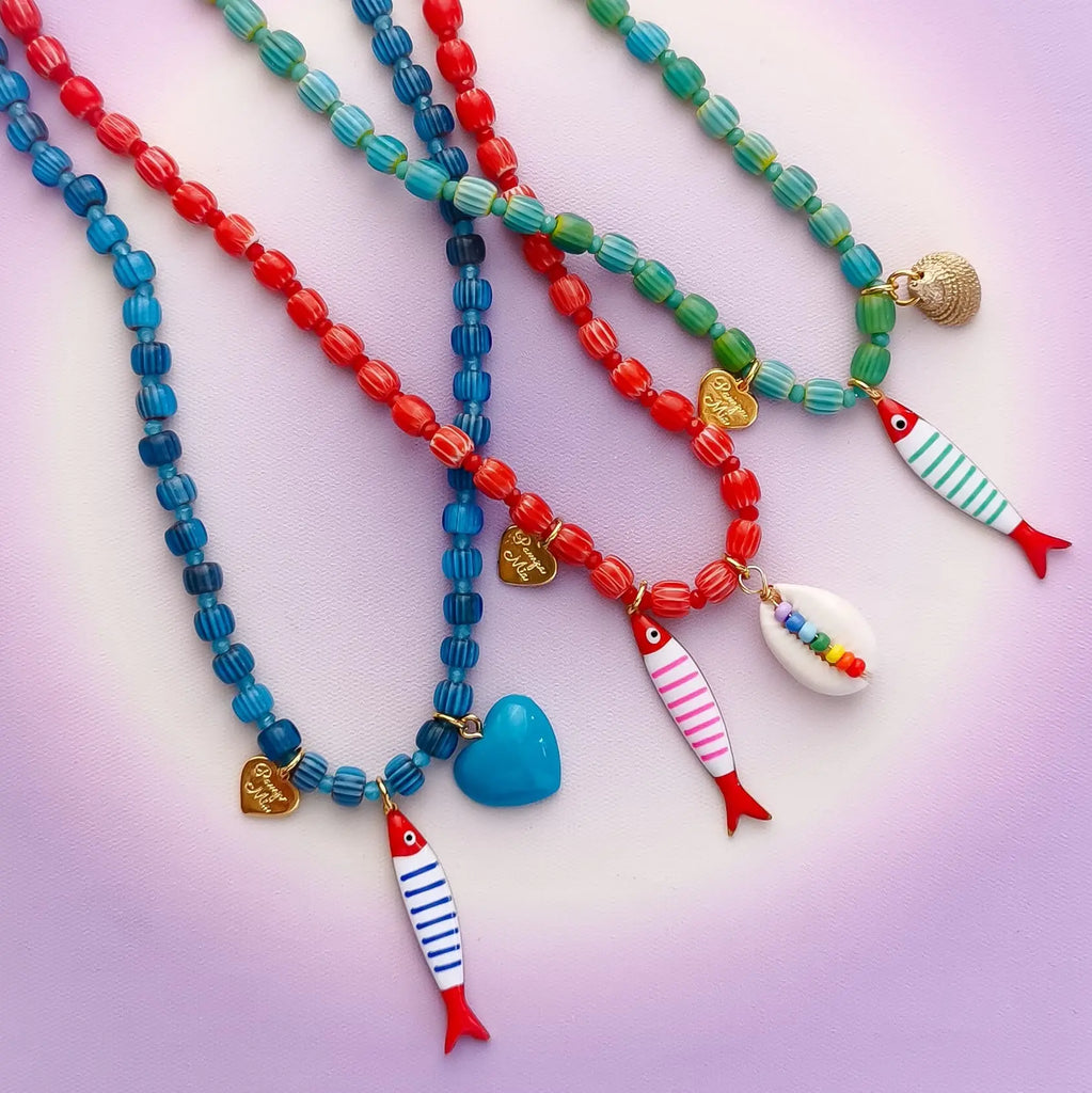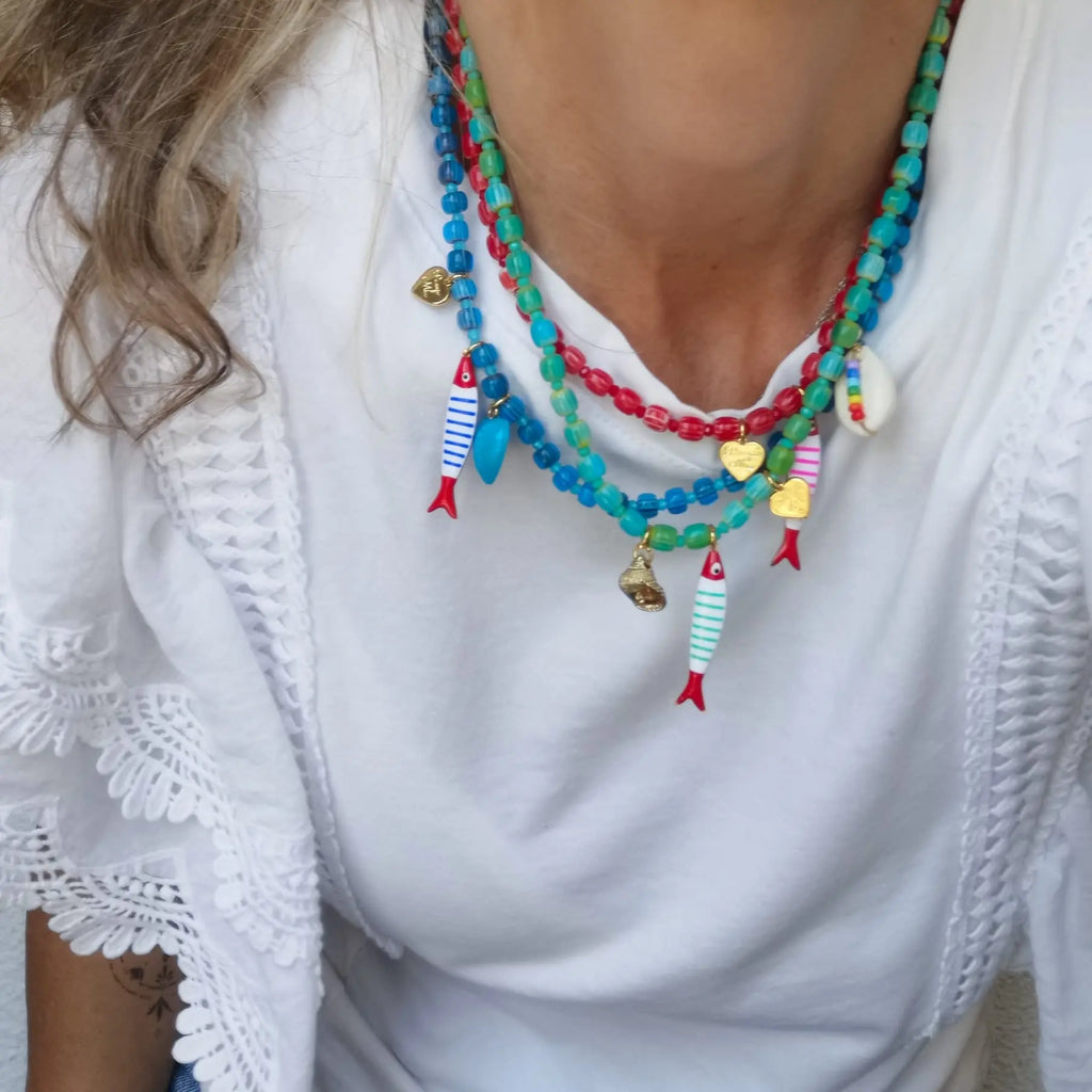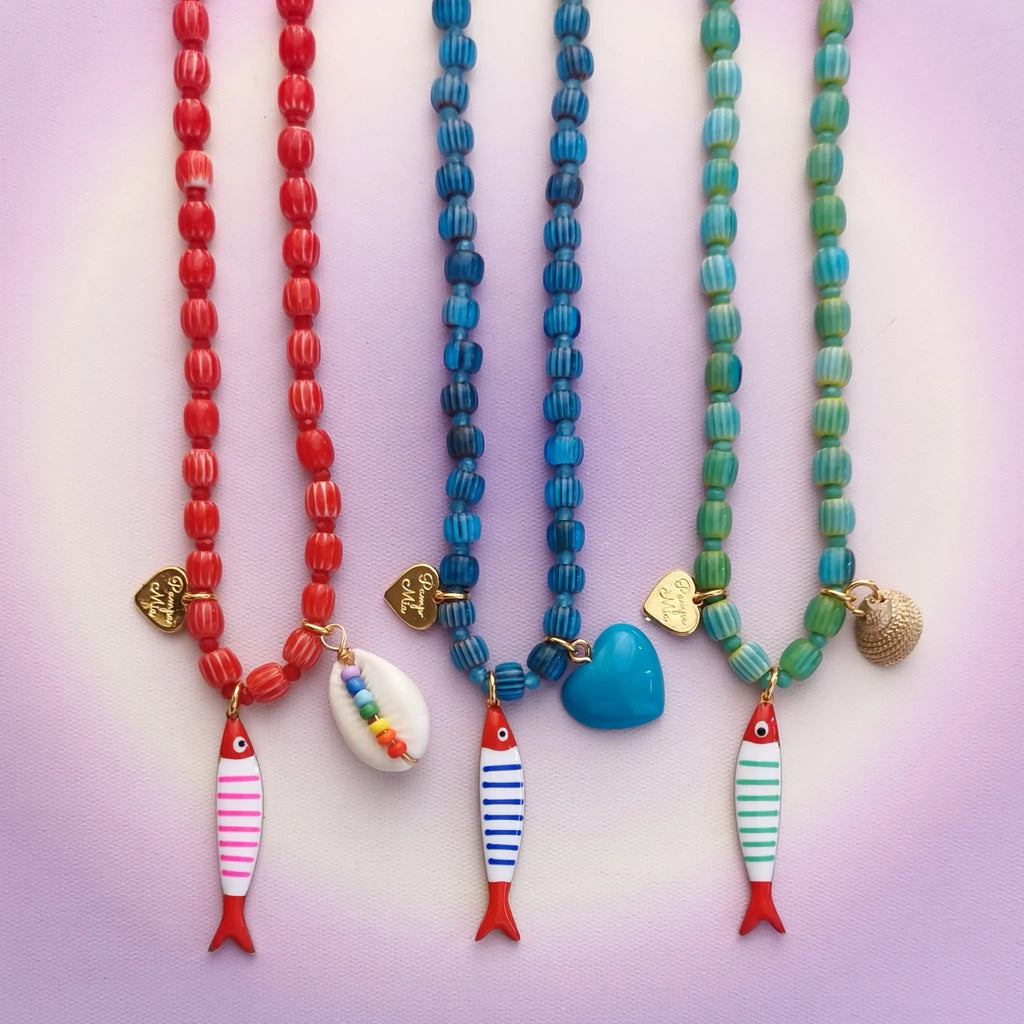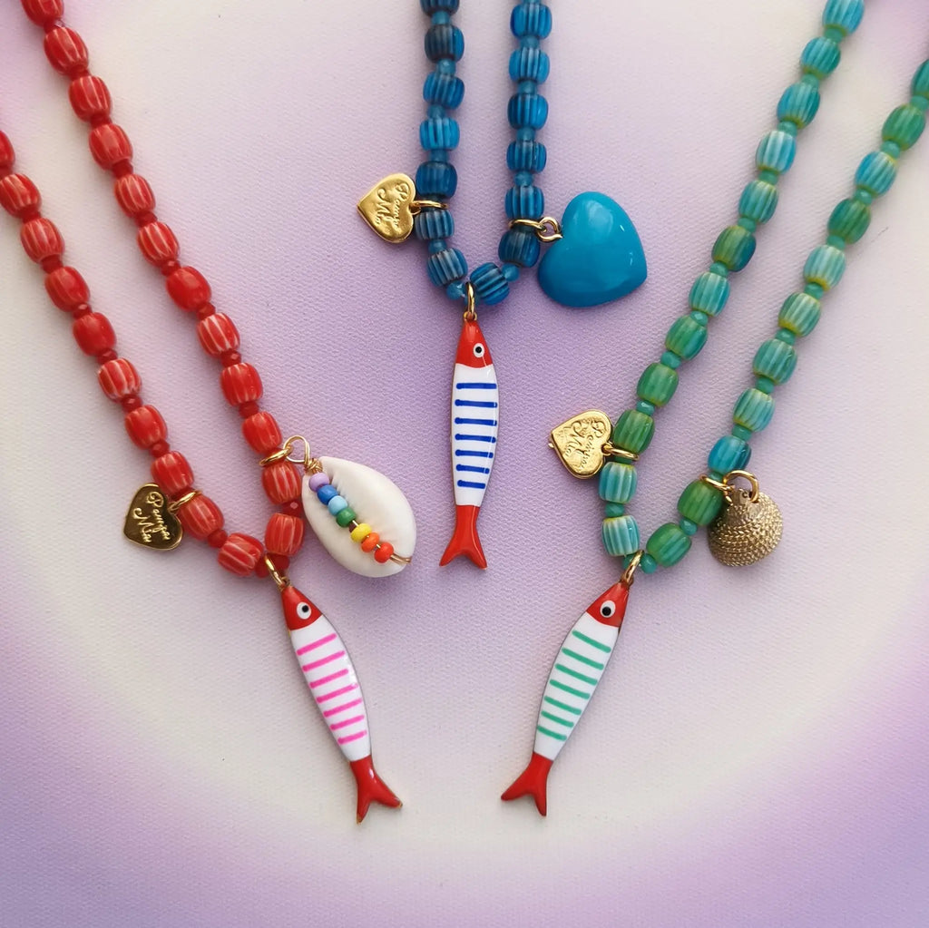 Fio com contas de missangas de vidro e pendente peixe em aço inox.