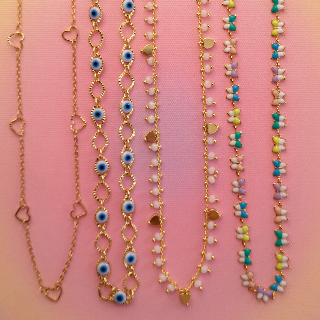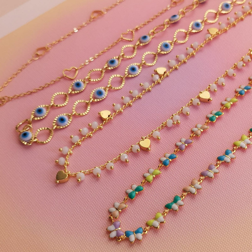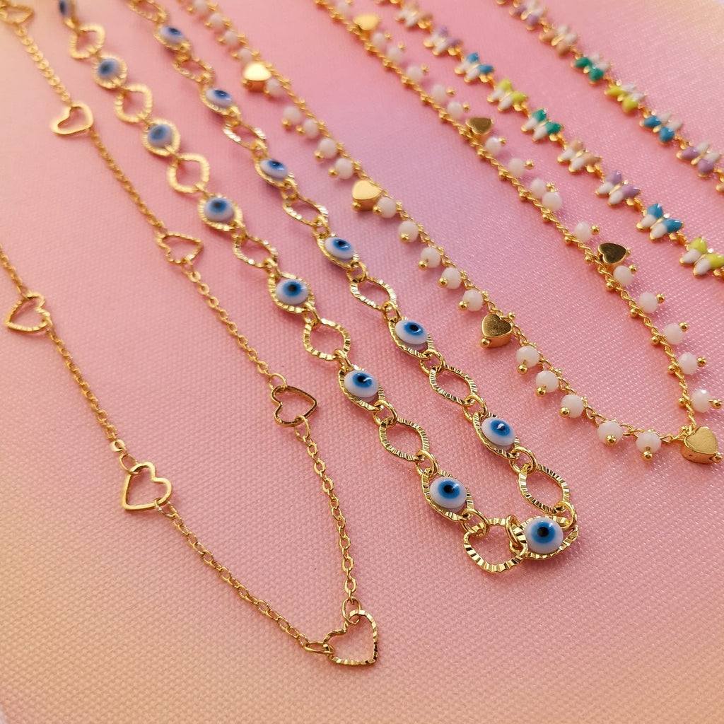 Fios curtos dourados em aço inox com varios formatos & pendentes: olho turco, missangas, corações ou borboletas.