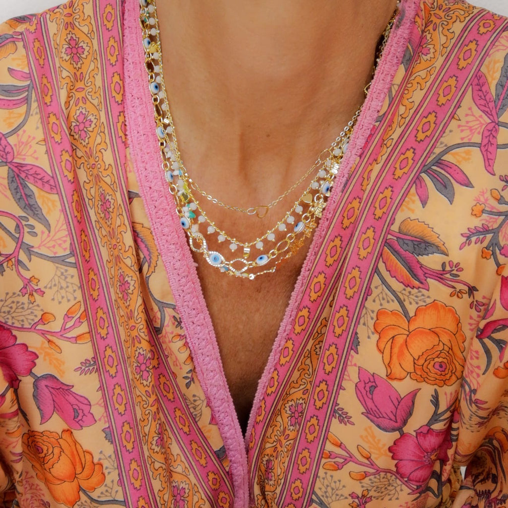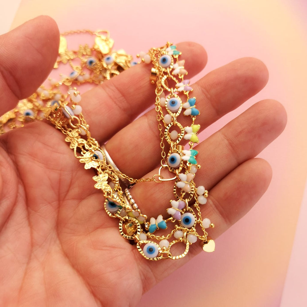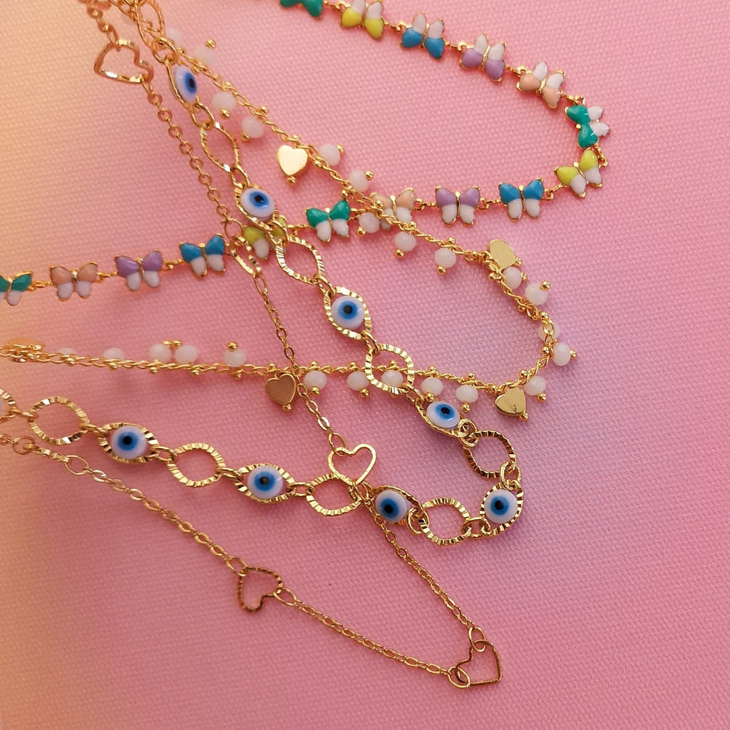 Fios curtos dourados em aço inox com varios formatos & pendentes: olho turco, missangas, corações ou borboletas.