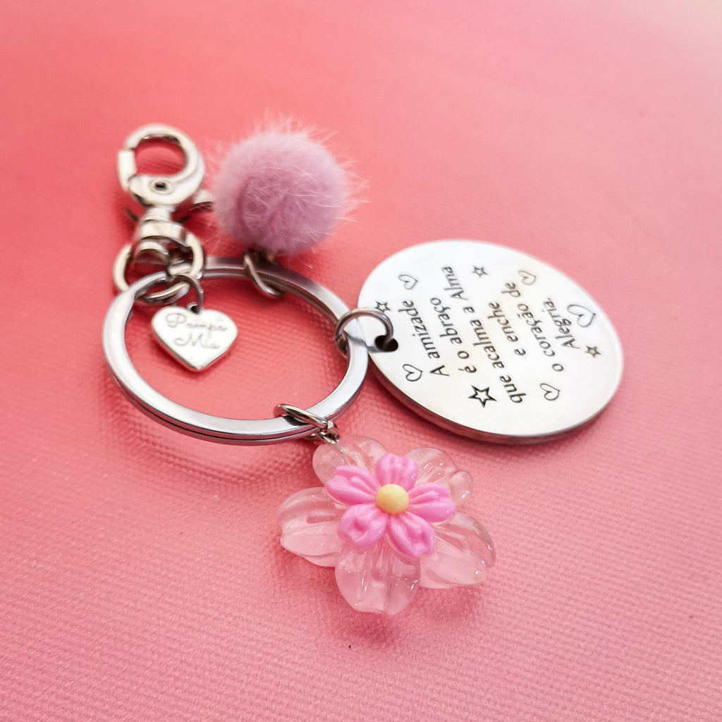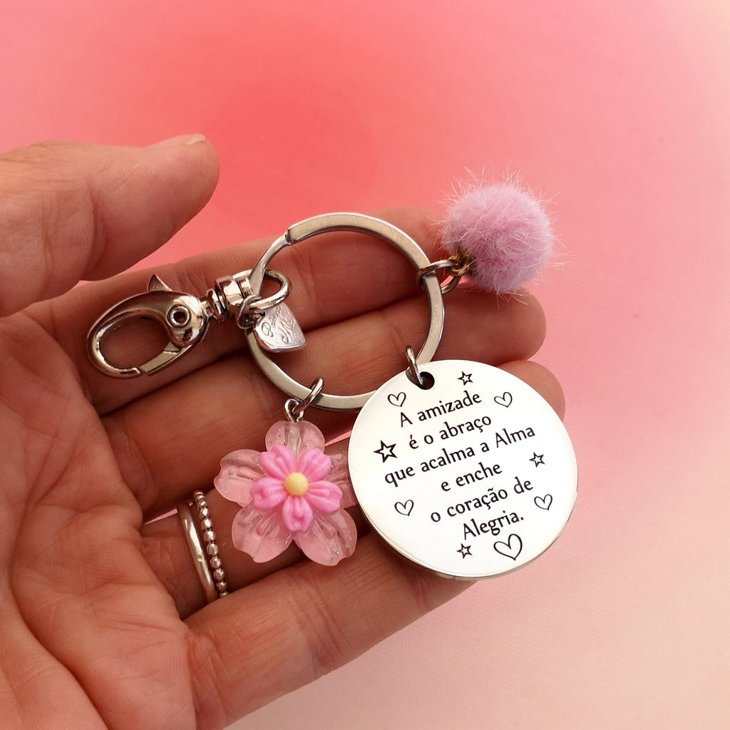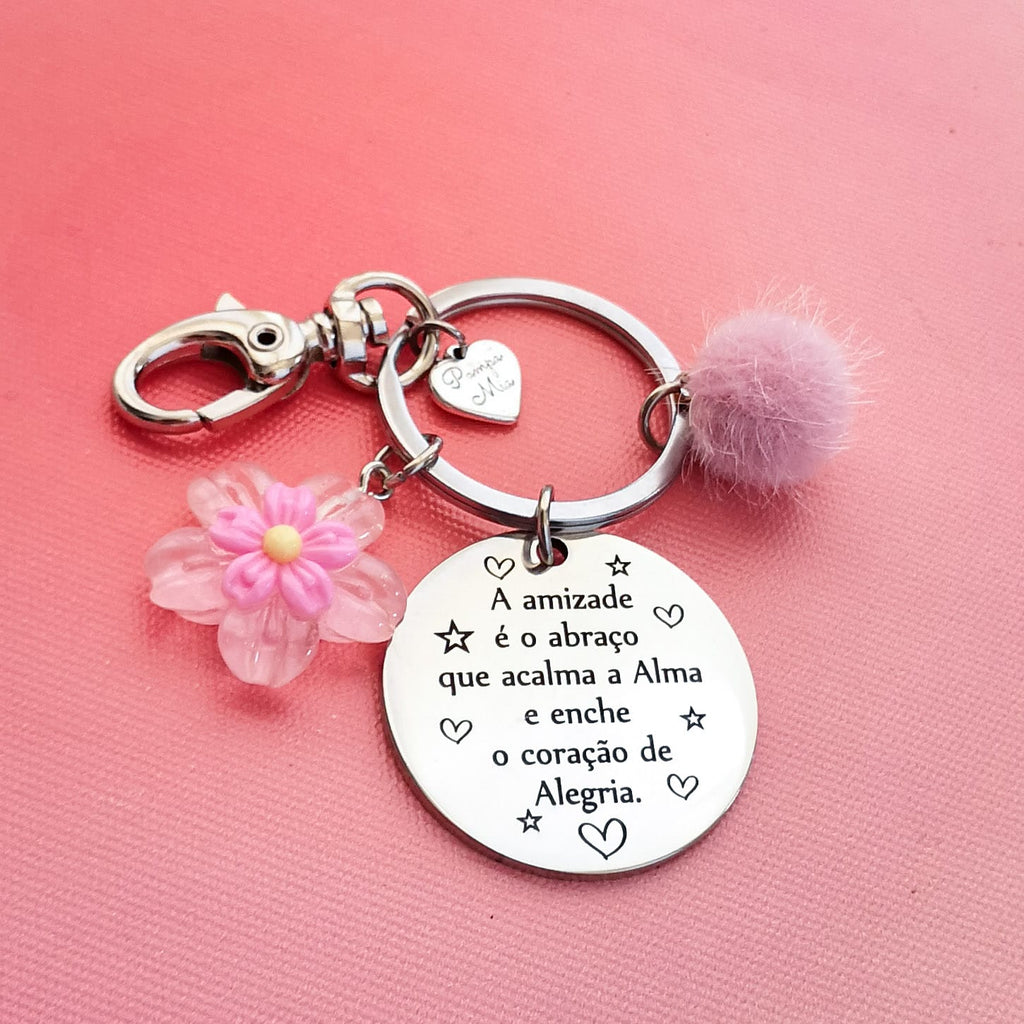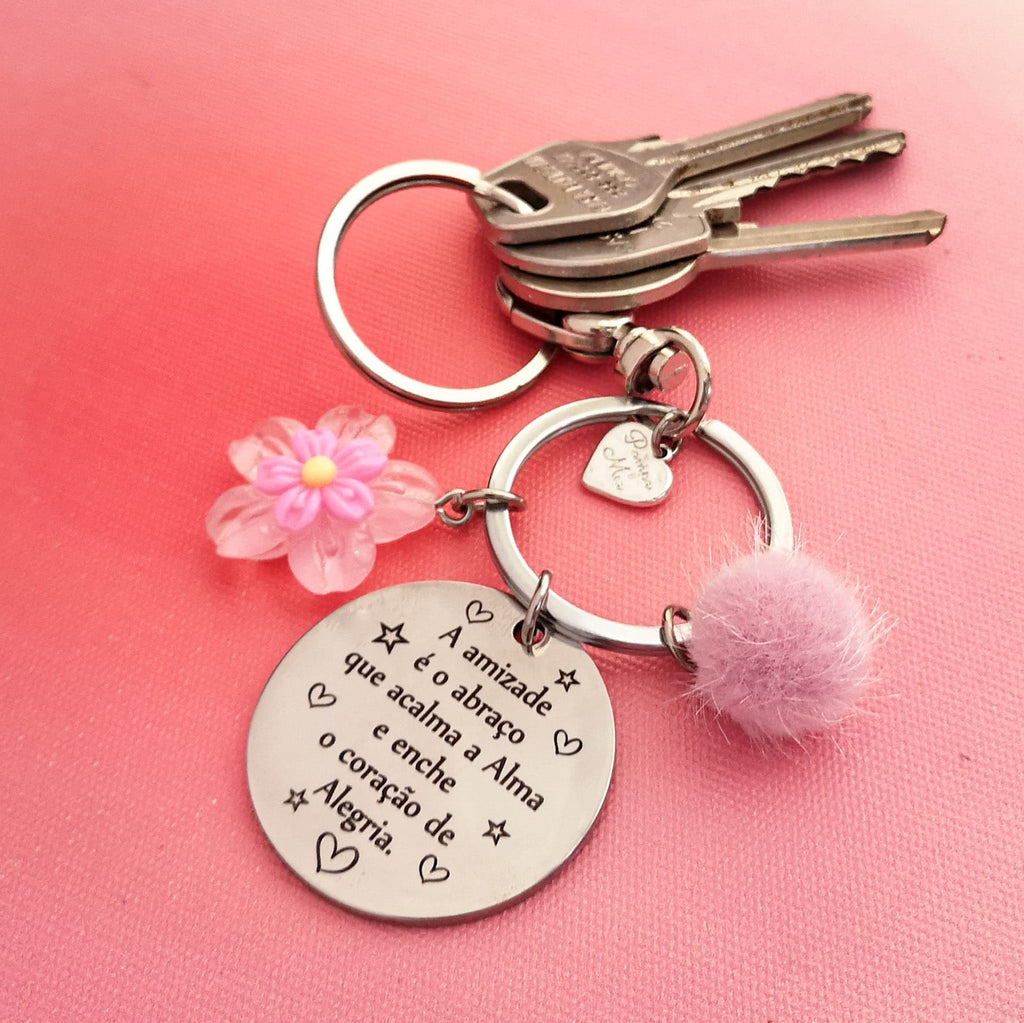 Porta-chaves em metal prateado, com vários pendentes, com a frase A amizade é o abraço que acalma a Alma e enche o coração de Alegria personalizada com até 2 nomes no verso.