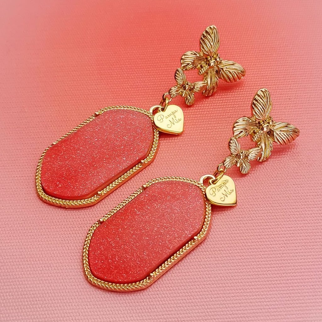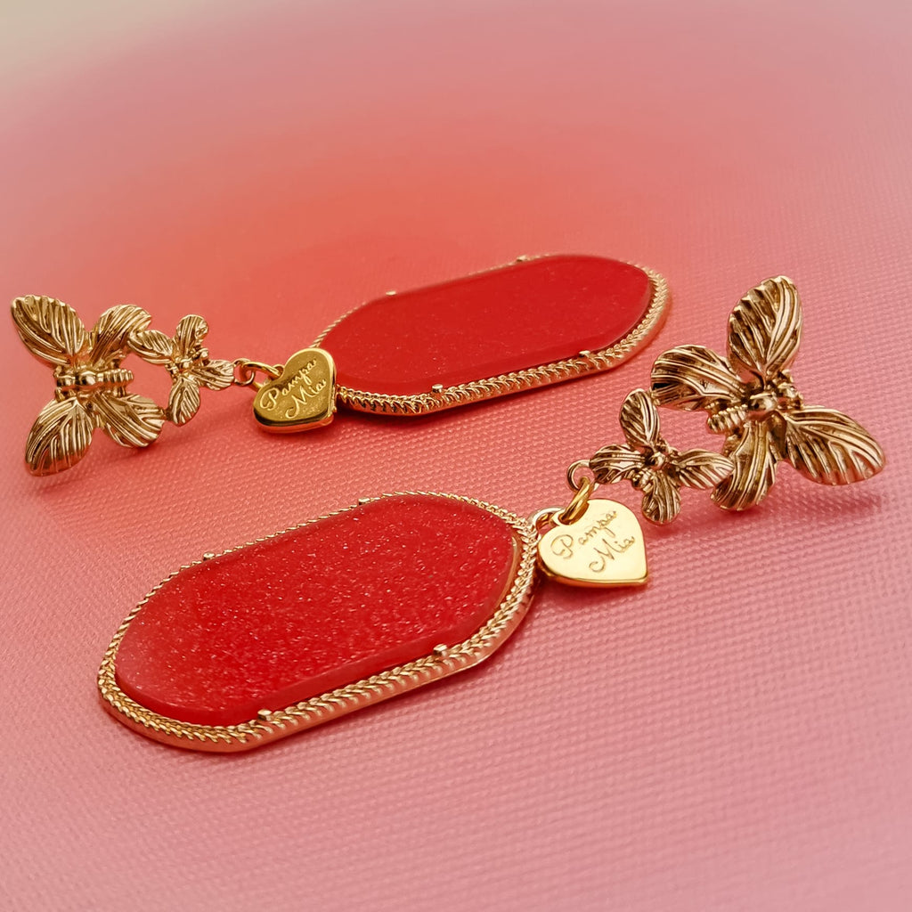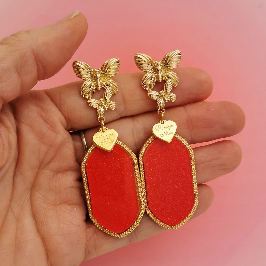 Brincos com fecho dourado de aço inox com dupla borboleta e peça vermelha rectangular.