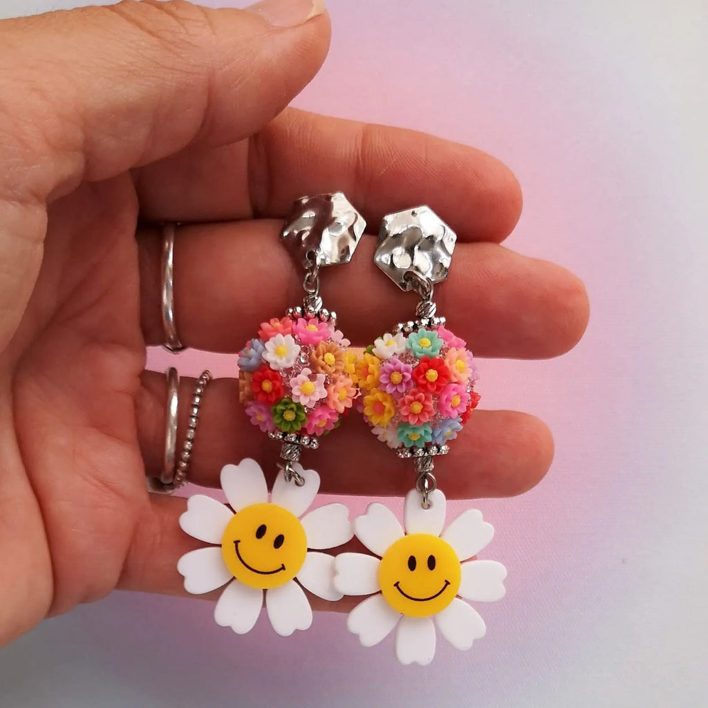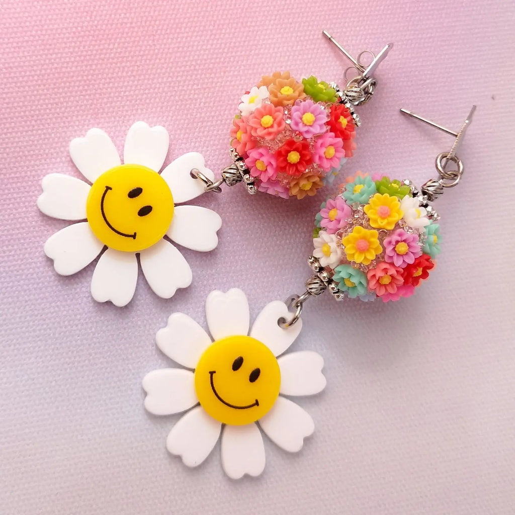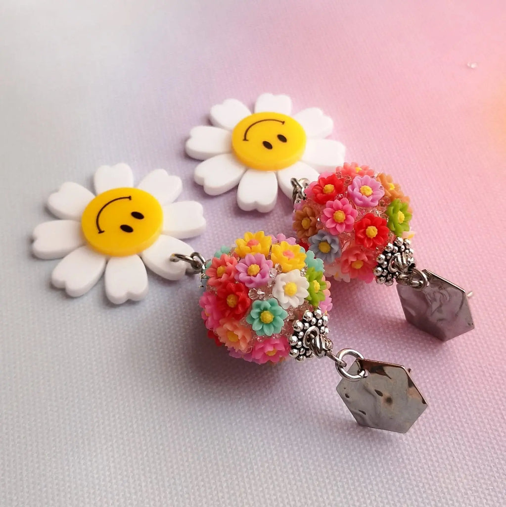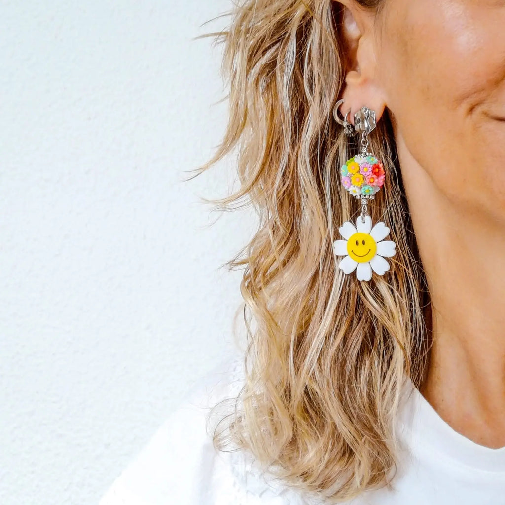 Brincos com fecho prateado em aço inox, flor branca smile e conta com mini flores multicor.
