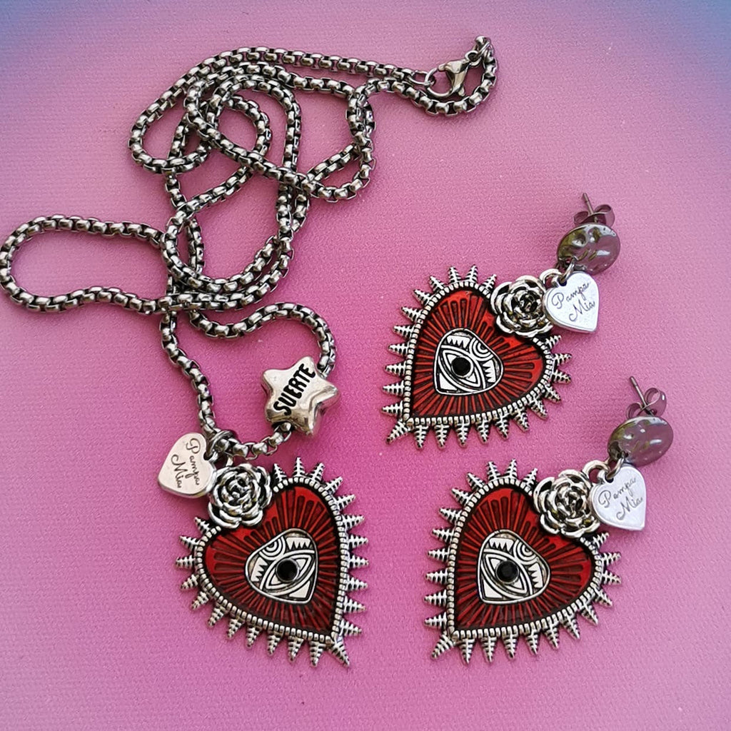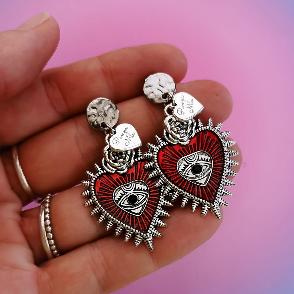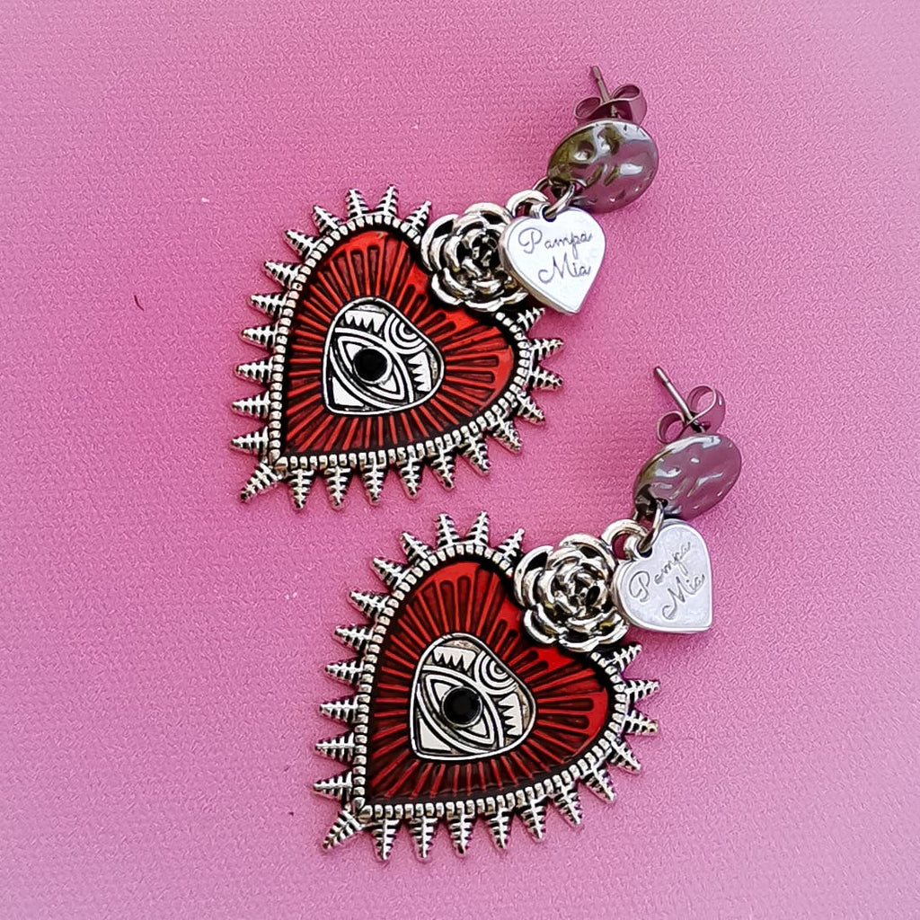 Brincos em aço inox prateado com pendentes milagro mexicano com pormenores em vermelho.