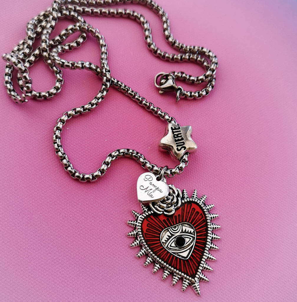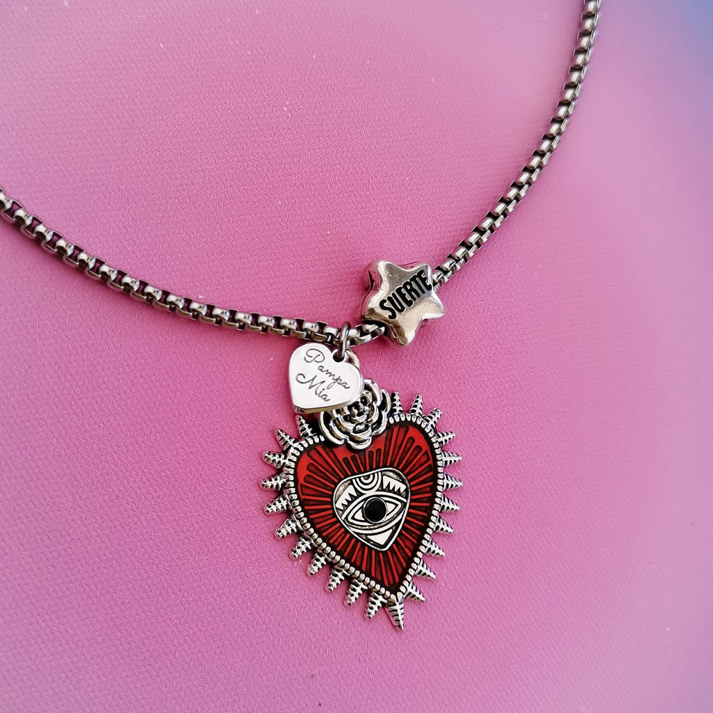 Fio em aço inox prateado com pendente milagro mexicano com pormenores em vermelho.