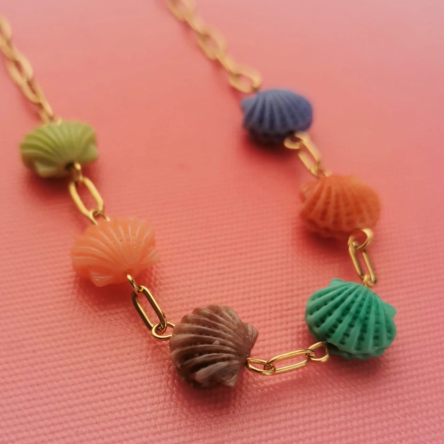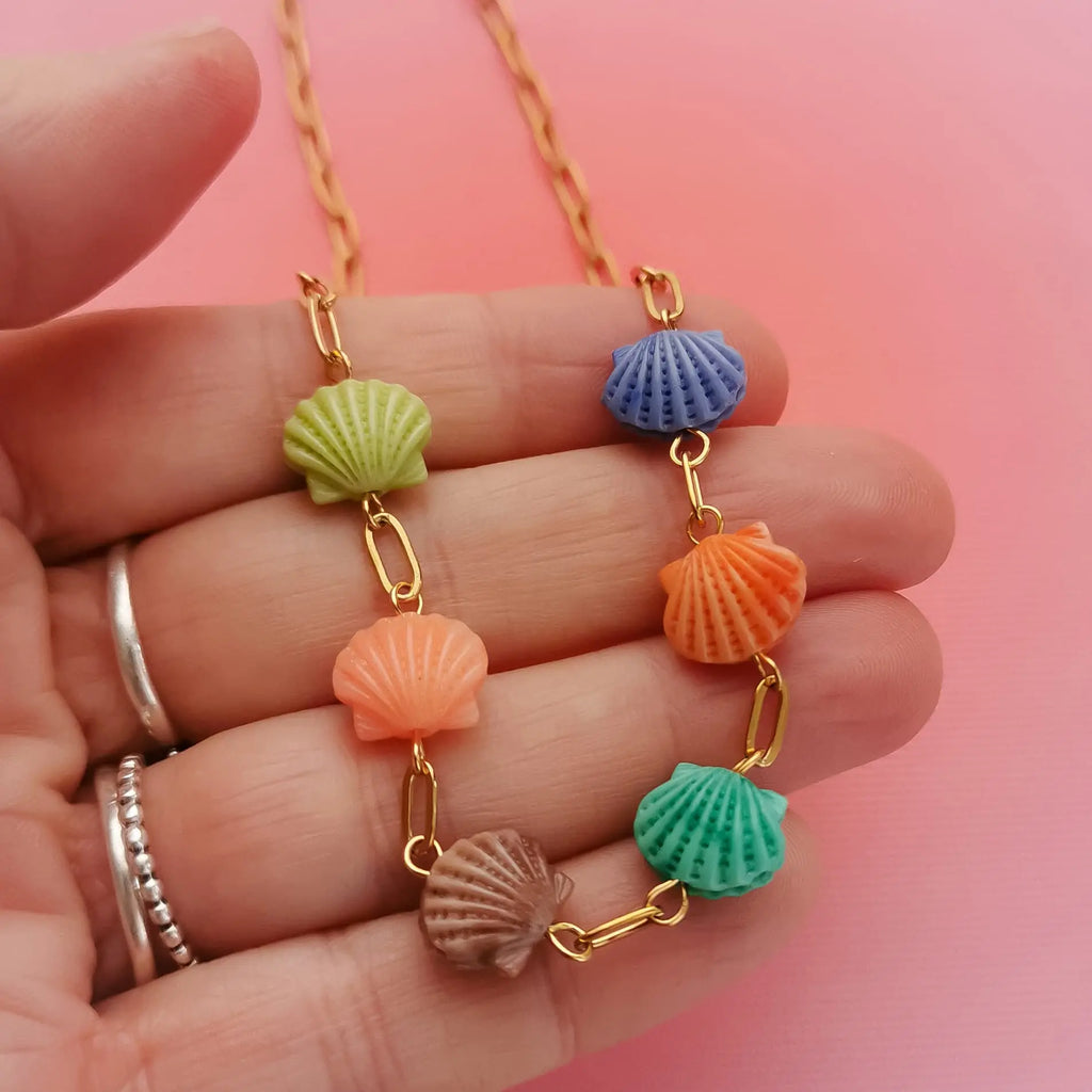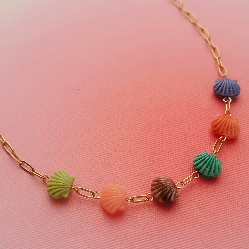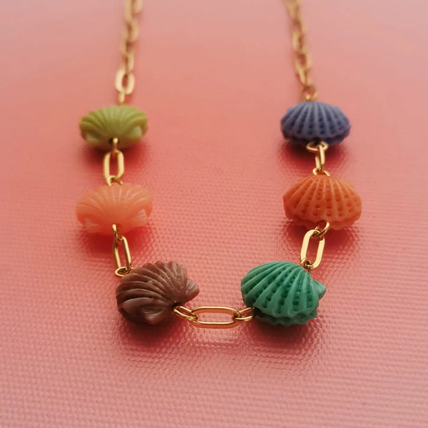 Fio em aço inox dourado com conchas acrílicas de varias cores.