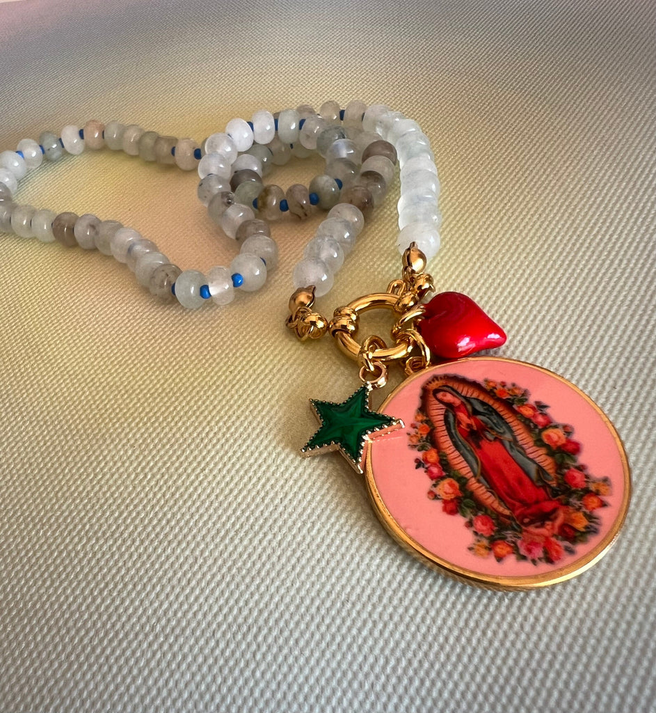 Fio com contas de vidro, fecho em aço inox dourado e pendentes virgem, estrela e coração.