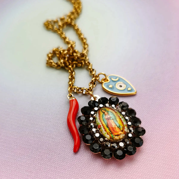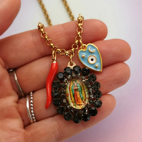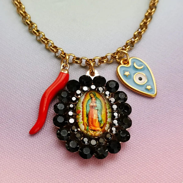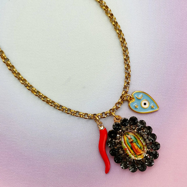 Fio em corrente dourada de aço inox com medalha Santa e lucky charms.