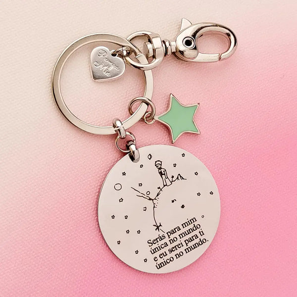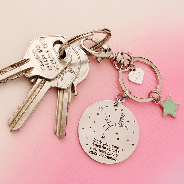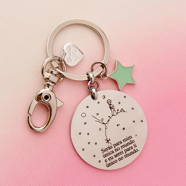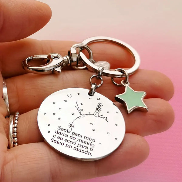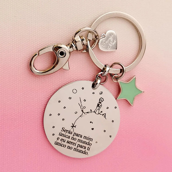 Porta-chaves em metal prateado com medalha aço inox prateada e estrela verde - Serás para mim única no mundo e eu serei para ti único no mundo - personalizado com até 5 palavras.