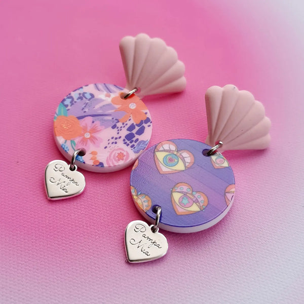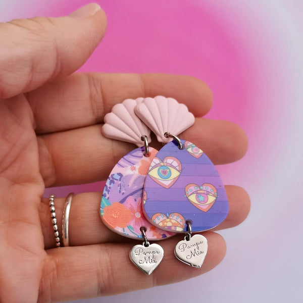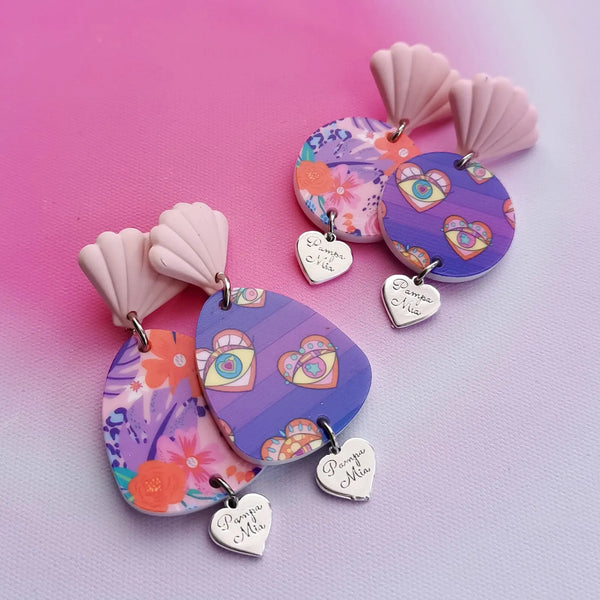Brincos em acrilico e metal amti alérgico. Desenho de corações e olhos turcos e fecho concha rosa claro.